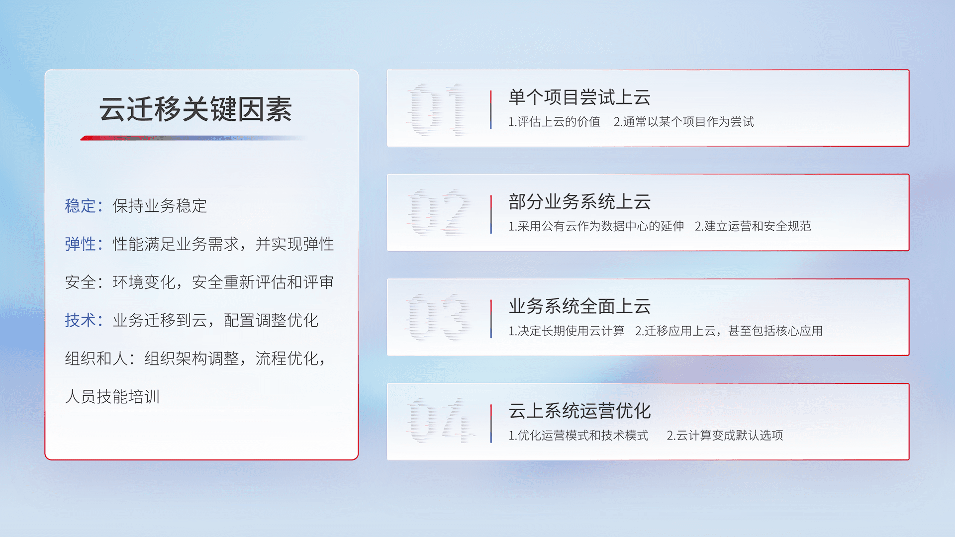 结合实际业务,,,,从规划设计、、、、云平台选型、、、云原生改造、、数据迁移、、、集成交付,,,,迁移全过程为客户识别最佳上云路径,,,做好风险识别管理,,,设计网络架构、、、身份权限、、、安全审计合规、、、操作审计、、、、日志审计、、监控告警策略、、多站点容灾设计等,,,,对云上基础设施进行整体规划,,提升IT治理水平,,,,以满足弹性、、高可用、、、、高性能的需求。。。