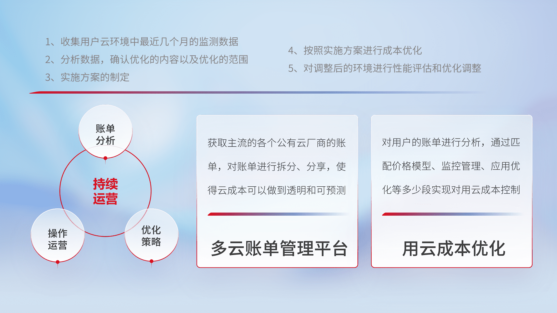 通过多云纳管,,以统一的资源数据模型把客户的云资源进行抽象和封装,,,,进而实现对多云资源的统一操作,,,保障云资源管理的可靠性、、、、稳定性与可用性。。量身定制化运维内容,,配置、、、开发运维、、补丁管理、、备份、、、、监控、、、、认证和访问管理、、、、审计和日常巡检等,,,,保障在用云过程中的可靠度,,,稳定度以及高可用率。。。