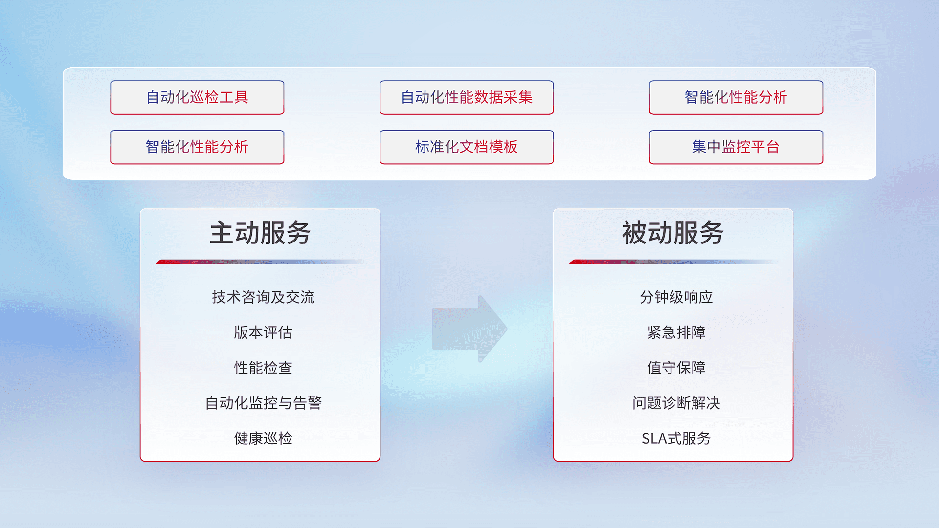 智能化工具和标准化文档,,,,保障服务质量,,,,提供主动服务(包含技术咨询、、、版本评估、、、性能检查、、自动化监控与告警、、、健康巡检)和被动服务包含(分钟级响应、、、、紧急排障、、值守保障、、、问题诊断解决、、、SLA服务)。。。。
